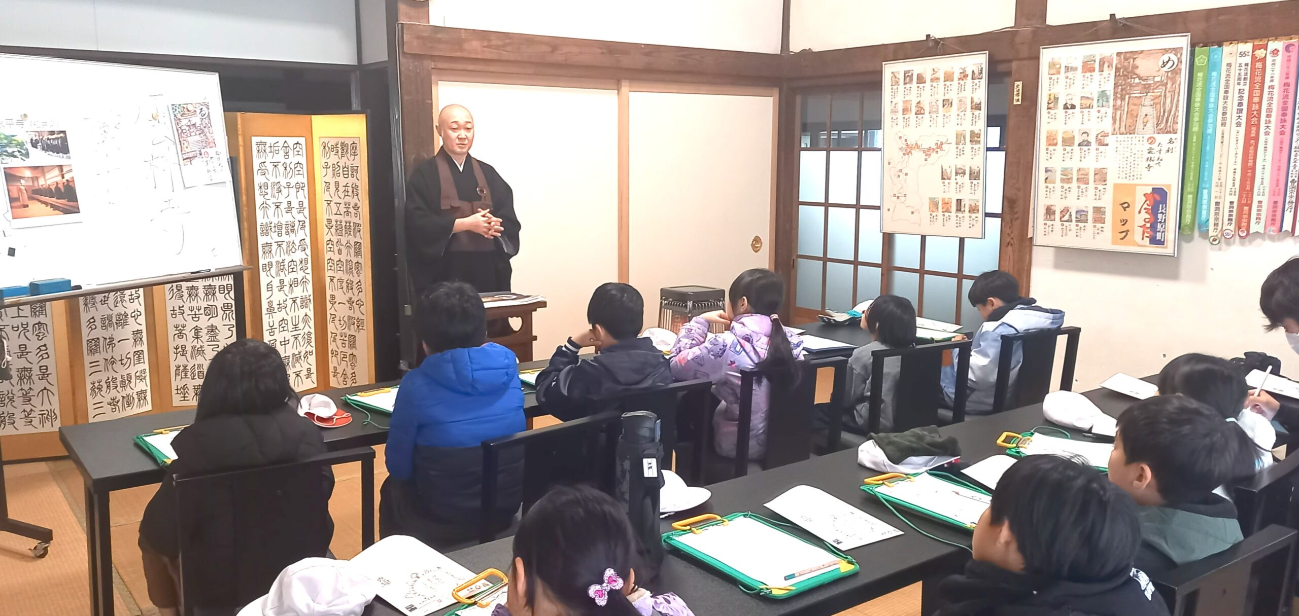 今日、校外学習で来られた子ども達は、目をキラキラさせ雲林寺の歴史、住職の修行時代の話等に興味を持って頂けました。